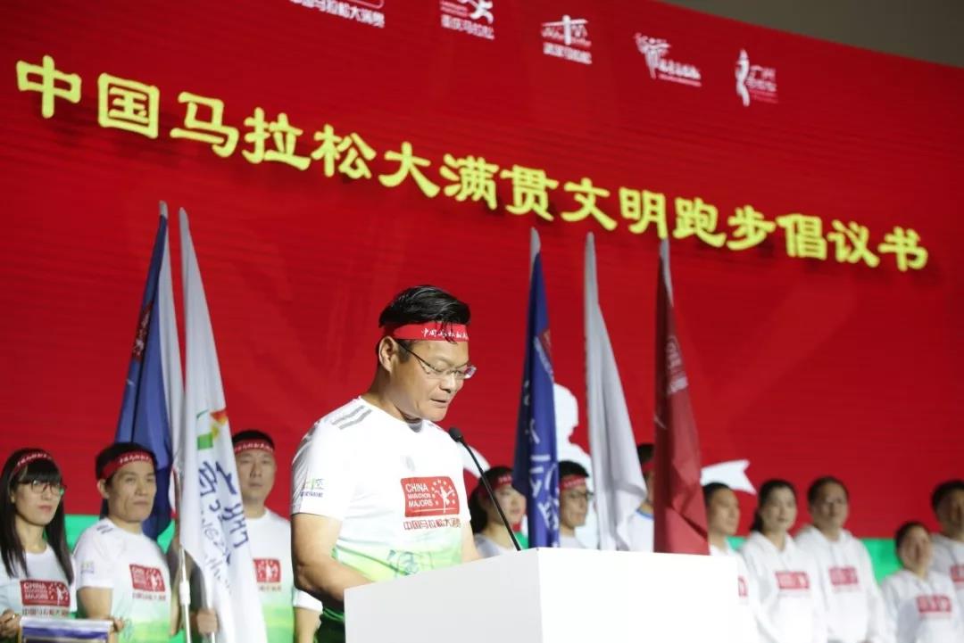 自這一刻起,中國馬拉松大滿(mǎn)貫北京、廣州、重慶、武漢公益跑團已全部建成,在“競技引領(lǐng)、公益為魂、文明跑步、健康幸?!崩砟畹闹笇?,中國馬拉松大滿(mǎn)貫城市公益跑團特別發(fā)布了“中國馬拉松大滿(mǎn)貫文明跑步倡議書(shū)”,并由武漢公益跑團執行團長(cháng)鄧超明進(jìn)行了現場(chǎng)宣讀!